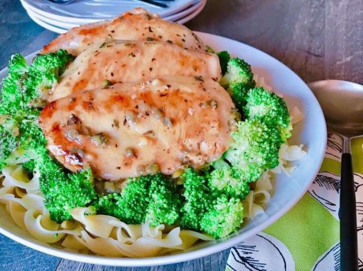 With this Easy Chicken Piccata recipe, I like to serve it with a green salad, fresh broccoli and No Yolks Broad Egg Noodles. Broccoli isn’t traditional in this recipe, but I like to add it because: