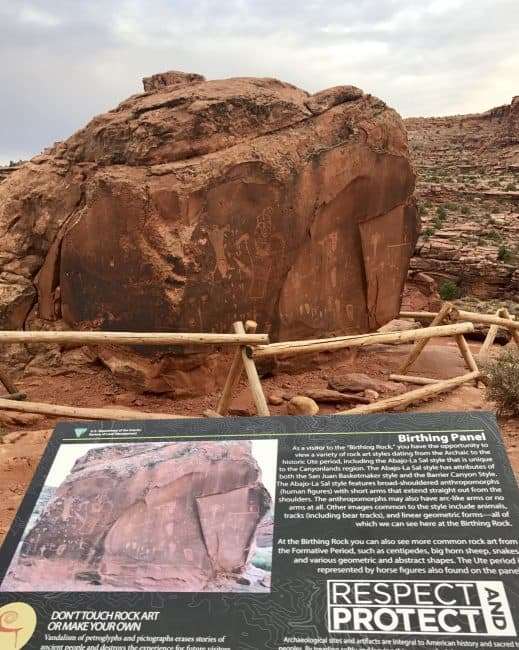 Petroglyphs can be seen all around the area. The Birthing Scene is a series of petroglyphs etched onto a huge boulder sitting on the side of Moab Kane Creek Access Road.